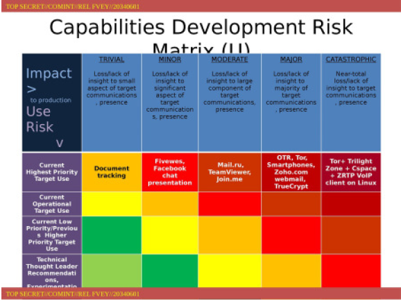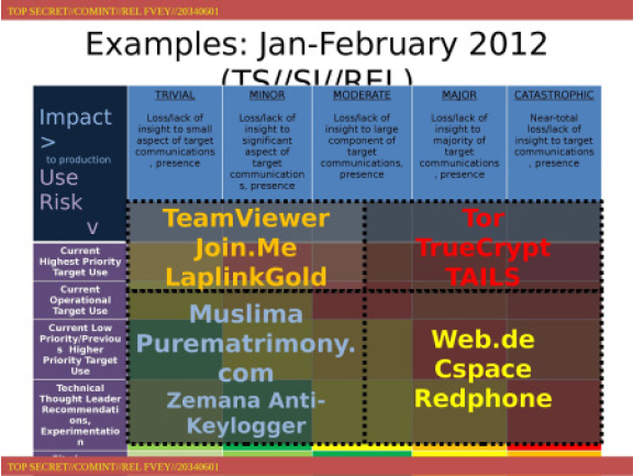 第五级别对于 NSA 来说具有“灾难性”,例如,当目标对象将另一种匿名服务 Tor、即时消息系统 CSpace,以及一款名为 ZRTP 的网络电话系统结合使用时。NSA 文档记载,此类结合可导致“对目标通讯近乎完全失去掌控的情况”。