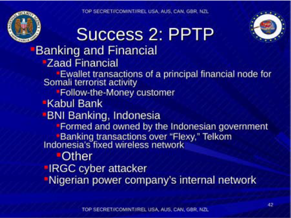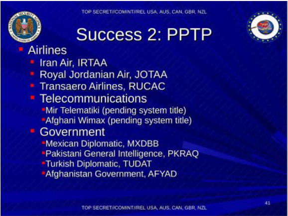他们用许多不同计划证明自己成功渗透了多个网络。监控受众包括俄罗斯洲际航空公司、约旦皇家航空公司,以及莫斯科电信公司 Mir Telematiki 。另一个值得吹捧的成功案例是 NSA 对阿富汗、巴基斯坦,土耳其等国外交官及政府官员的监控活动。